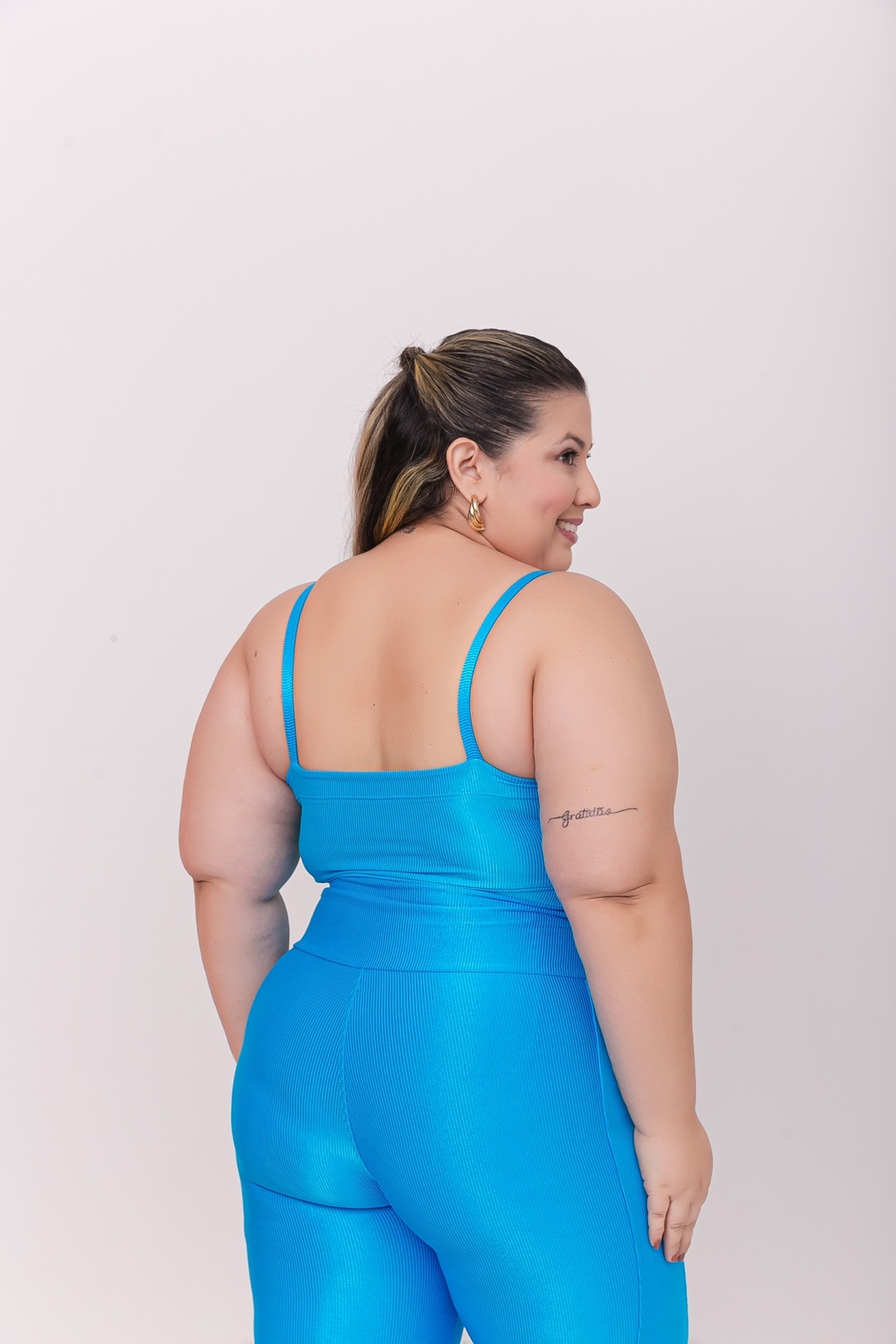 Nosso conjunto é feito na malha fria canelada, com alta compressão, zero transparências e cintura alta que modela a silhueta sem marcação.